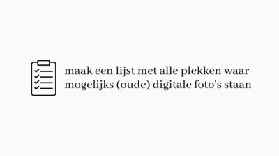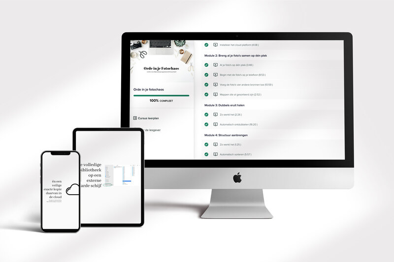 De grootste overwhelm ontstaat doordat je foto's overal verspreid staan. In de eerste fase van de cursus leer ik je hoe je al je foto's op één plek samenbrengt. Ongeacht hoeveel dubbels of driedubbels er zijn of hoe groot de chaos ook is, je voelt je al meteen een pak lichter als ze allemaal op één plek staan.